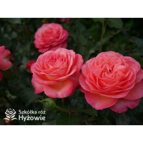 Vulcano®  Duży kwiat, nabity płatkami, pięknej koralowej barwy, bardzo przyjemnie pachnie. Ciemnozielone liście. Niski krzew.